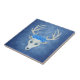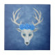 Ce carrelage décoratif en céramique est d'un bleu brumeux avec une tête blanche d'imaginaire d'un cerf qui a des bois et trois grands roses bleus sur le dessus de sa tête.