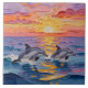 An ai impasto style dolphins swimming with a pink, orange and purple sunset over the ocean . A beautiful coastal tile to add a beachy touch to your backsplash or tile craft project.