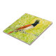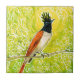 Carrelage en céramique avec croquis d'oiseau coloré. Moucherolle du Paradis Indien, oiseau tropical assis sur une branche d'arbre, feuilles jaunes colorés et fleurs en arrière - plan. Palette de couleurs : Chartreuse, Vert pomme, Primrose et Pear Yellow, Blaze Orange, Noir Marqueurs acryliques et encre sur papier, 2019. www.clipsocallipso.art #flycatcher #birds #markersketch #birdart #tropicalbirds #chartreuse #greenjaune #clipsocallipso #ceramictile #bathroomdécor #bathomendkitchomidea ecor #zazzle #zazzlemade