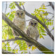 Par une lumineuse journée printanière, deux jeunes chouettes rayées sont perchées dans un arbre et regardent le photographe.