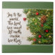 Belle céramique de Noël représentant des branches de pin avec des baies et des étoiles sur un arrière - plan en bois et présente le bien-aimé Carol de Noël, "Joie au monde, le Seigneur est venu! Que la terre reçoive son Roi."