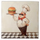 "jolly chef presents hamburger", "cook serves burger on tray", "chefs hat loves burgers", "black and white diamond floor", "meat burger grill kitchen fun", "cooking themed ceramic tile", "beige cream light neutral", "happy smiling face smile", "moustache mustache italian man", "french gourmet professional staff"