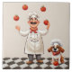 "jolly chef juggling tomatoes", "red tomato juggle cook", "cute dog chefs hat", "black and white floor", "humorous silly kitchen fun", "cooking themed ceramic tile", "beige cream light neutral", "happy smiling face smiles"