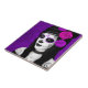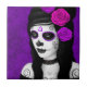 Caractéristiques de conception ce uniques une belle femme avec les roses pourpres dans ses cheveux. Son visage est décoré dans le style du jour des crânes morts de sucre qui inclut des lignes de tourbillonnement, une bouche piquée et un nez noir. Les grands cercles noirs qui sont entourés par de petites pédales rondes de fleur apparaissent autour des yeux et d'un petit coeur à l'envers de la fille se repose au milieu de son front. Les cheveux de noir de jais de la femme tombent vers le bas au-dessous de ses épaules et se mélangent dedans à sa robe noire de dentelle. Ce motif élégant est un bel exemple de ce jour des vacances mortes.