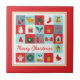 Joyeux Noël mignon Rétro hiver Icônes Noël Carreaux décoratifs en céramique présente le texte "Joyeux Noël" dans la typographie de script rouge moderne accentué avec des icônes de Noël tels que rennes, arbre, stockage, cloche, bonhomme, cadeau, couronne, sainte, étoile, sucre de canne, pain d'épices, ange et plus. Conçu par Evco Holidays www.zazzzle.com/store/evcoholidays