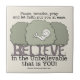 Little Boy est vu dans une pose détendue en haut des arbres illustrant la citation ci-dessus qui nous rappelle de pause, respirer, prier et laisser la foi vous mettre à l'aise. Les formes des troncs de ces arbres épellent le mot "CROYEZ" et la citation, "dans l'incroyable qui est VOUS!" ci-dessous qui complète le proverbe bien connu de David A. Carrizales. Dessin de Christie Black.