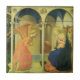 L'Annonciation du Prado par Fra Angelico, vers 1435. La scène est divisée en trois parties, le jardin, l'arche de l'ange et l'arche de la Vierge. Adam et Eve sont expulsés du jardin d'Eden et un rayon de lumière divine illumine à travers la colombe du Saint-Esprit, la Vierge, qui s'incline en acceptant son devoir avec soumission.