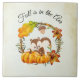 Un carrelage en céramique avec un design typographique qui dit que Fall est dans l'air. Illustré par un adorable écureuil debout derrière quelques citrouilles orange aquarelle. Une couronne feuillue les entoure d'une feuille de chêne, d'un cordon, de fleurs d'orange d'automne et d'autres sprigs et feuilles. La couleur Arrière - plan est un vintage blanc cassé aux bords marron clair vieilli.