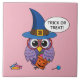 A cute cartoon wizard owl doing trick or treat on Halloween. The violet owl is wearing a wizard hat and big red round eyegläund and has an orange jack-o-lantern bucket full of candies. Parfait pour Halloween.