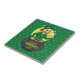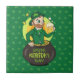 Carrelage en céramique avec l'illustration d'un leprechaun souriant portant un costume vert, une cravate arc-en-ciel, et un casquette de bowler assis dans une casserole d'or et tenant une pinte de bière, avec arc-en-ciel jaune, vert et orange dans l'arrière - plan. L'image est placée sur un arrière - plan vert foncé transparent avec des shamrocks. Un design parfait pour célébrer la Saint Patrick !