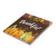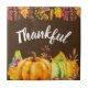 Une tuile avec le texte : Merci (peut être édité / changé à autre chose). Conçu avec une aquarelle illustrant les citrouilles, les glands, les champignons et les feuilles d'automne saisonnières. Une bordure le long du sommet se compose également de feuilles d'automne, de baies, de glands et d'autres feuillages. Arrière - plan brun foncé.