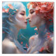 Deux sirènes époustouflantes aux cheveux flottants s'embrassent doucement, entourées de fleurs aquatiques colorées dans un cadre sous-marin serein.
