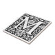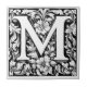 Lettre illuminée médiévale M Carrelage en céramique Illustration vectorielle en noir et blanc de la lettre dans un style médiéval élaboré, créé dans le style d'Albrecht Dürer. Le design est un carré avec un grand motif floral central entouré de motifs et tourbillons géométriques symétriques.