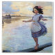 Jessie Willcox Smith était une artiste américaine connue pour son image idyllique de l'enfance. Elle a été l'illustratrice de couverture pour le magazine Good Housekeeper pendant 15 ans.Une jeune fille en robe et tablier équilibre pieds nus sur un poutre au-dessus des eaux calmes. Dans l'arrière - plan, il y a des reflets de maisons et un ciel nuageux sur la surface sereine de l'eau. Ce tableau s’appelle "Petit Eml’y".