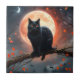 Sur Une Branche D'Arbre Gnarly En Face D'Une Pleine lune Avec Des Chauves Volantes Dans L'Arrière - plan Est Un Chat Noir Aux Yeux Oranges.