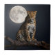 A powerful leopard with piercing yellow eyes and a sleek, spotted coat sits majestically on a stark, solitary branch. One paw dangles artfully across the center of the illustration, hinting at movement. Behind him, a vast, luminous harvest moon hangs in the inky night sky, casting an ethereal glow. Awesome tile for anyone who loves leopards.