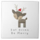 Un carrelage en céramique mignon et festif à l'atmosphère minimaliste et fantaisiste. Illustration de charme d'un cerf brun en bois portant un chapeau de santa rouge - style hipster. Texte dit : Mangez Boire Soyez Joyeux dans une police simple.