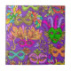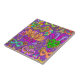Ce carrelage en céramique festive présente un design Mardi Gras de la mascarade fait dans un défilé de couleurs et de motifs dont vert, violet, bleu, rose, orange et or sur un arrière - plan violet. Conçu par un artiste de renommée mondiale © Tim Coffey.