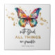 Un beau papillon à l'aquarelle avec des accents dorés et le verset biblique Matthieu 19:26 "Avec Dieu, tout est possible" carreau en céramique