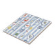 Vintage seafood pattern ceramic tile with sardine cans, lobster, crab, fish, mussels, lemon, wine, and herbs on blue and white stripes. Mediterranean coastal aesthetic with a classic sketch style. Ideal for food lovers, chefs, coastal style fans, and Mediterranean lifestyle enthusiasts.