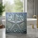 This sculptural-effect tile features a richly textured starfish, detailed with prominent knobs, set amidst swirling sea kelp and waves. The star is flanked by smaller companions, creating a sense of depth and movement. Finished in the signature iridescent metallic sheen, the piece shifts elegantly in the light, showcasing hues of pearlescent silver and pale aqua. A sophisticated, high-end accent perfect for luxury powder rooms or shower installations. Search ID1223 to see other marine elements in this dramatic metallic series. Note: design may contain generative content.