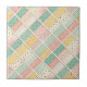 A seamless geometric pattern ceramic tile featuring a playful blend of polka dots, stripes, and plaid grids arranged in diamond formations. Rendered in a warm retro palette of mustard yellow, terracotta, mint green, blush, and cream, this design evokes mid-century charm with a modern twist. The mix of hand-drawn lines and dotted textures gives it a cozy, artisanal look.
