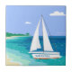 Monogram Voilier Côtier Carrelage Tropical en céramique. Un voilier avec votre nom sur elle s'approche d'une plage. Vue sur la mer tropicale. Idéal pour la salle de bain à thème nautique. Bleu, turquoise, mousse de mer, turquoise, vert, blanc.