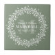 Calligraphie de couronne fleurie Typographie Monogramme Carrelage en céramique à Sage Vert et Blanc - Cadeau en céramique monogrammée verte et blanche élégant pour un couple nouvellement marié qui comprend un monogramme personnalisé, noms de mariés et de mariés, nom de famille et modèles de date mariage entouré d'une courageuse couronne d'art floral. Un cadeau de conservation bien pensé pour la fête de ménage ou le cadeau de mariage d'un couple. ©sweetwhimsypaperie