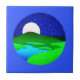 Carrelage en céramique, illustration circulaire d'une pleine lune qui s'élève au-dessus de collines vertes au bord d'un lac, avec un ciel étoilé bleu nuit