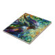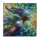 Une sirène stylisée présente une mosaïque de tuiles chatoyantes dans des teintes vibrantes de bleu, vert, violet et orange. L'éclairage renforce son éclat métallique, tandis qu'un arrière - plan abstrait complète sa forme artistique. Une version vers la GAUCHE de cette image est également disponible. Les bords flous sont intentionnels et créent de la profondeur.