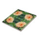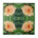 Le motif sur ce petit Carrelage en céramique a été fait à partir d'une photo originale. La fleur d'Hibiscus orange que nous voyons sur la photo est en train de regarder au milieu de quelques frondes de fougères vertes dans un joli jardin. La fleur est en pleine floraison, avec ses bords feutrés qui se détachent de l'arrière - plan des fougères. La forme de la fleur est comme une trompette, courbant vers l'extérieur, avec des points rouges sur les tiges jaunes au centre de la fleur. La photo est un closeup montrant le détail dans les pétales de fleurs de cette beauté colorée pêche.