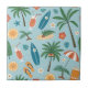 Carreau de céramique à motif tropical lumineux représentant des palmiers, des planches de surf, des tranches de citrus, des tongs, et des boissons fruitées dans un style amusant inspiré de l'été. Idéal pour les amoureux de la plage, les surfeurs, les fans de vacances, et tous ceux qui aiment l'esthétique tropicale colorée.