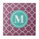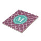 Un motif arrière - plan en treillis marocain tendance, élégant, girly prune violet quatrefoil avec un cadre étiquette bleu et blanc aqua pour votre lettre initiale monogramme personnalisée.