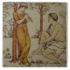 Voici une reproduction d'un ensemble de carreaux de Josiah Wedgwood & Sons qui présente des musiciens dans une orangeraie. Dessiné par Thomas Allen, le carrelage présente des personnages de style classique avec une variété d'instruments de musique. Cette tuile montre une femme jouant d'un instrument en forme d'enregistreur tout en se penchant contre un oranger. Un homme est assis devant elle, appréciant manifestement le concert.