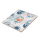 Nautical crab pattern ceramic tile with sketch-style crabs in blue and orange, framed in decorative ovals over soft blue and pink brush stroke stripes. Textured coastal aesthetic with a modern vintage feel. Ideal for seafood lovers, beachgoers, coastal style fans, and nautical trend enthusiasts.