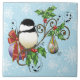 Chickadee mignon assis sur une branche d'arbre en hiver avec des flocons de neige tombant tout autour. Les ornements de Noël pendent de la branche d'arbre sur laquelle le poulet est assis.
