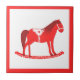 Cette magnifique tuile de Noël à motifs à motifs dispose d'une image art numérique d'un mignon cheval à bascule de style scandinave. Le cheval est rouge avec une crinière rouge foncé, la queue et les sabots. Le cheval sympathique sourit. Il a une selle blanche et des rois avec de jolis motifs de style Scandi rouge sur la selle, y compris le soleil, la lune et les étoiles, les coeurs et les fleurs. La base du cheval rocking est rouge et est couverte de feuilles blancs. Le design a été inspiré par le cheval suédois Dala.