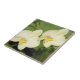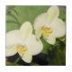Avec un look un peu rétro en tissu, deux orchidées blanches d'ivoire sont au centre de la photographie originale de MaeFlowers sur ce petit Carrelage en céramique. Les belles fleurs sont en pleine floraison, vue closeup contre un doux accent arrière - plan de verts naturels dans le jardin, fougères et autres feuilles, et gazon. Les fleurs ont des parties jaunes au centre, et un nouveau bourgeon vert pâle émerge en haut à droite de la photo. Ce design à contraste élevé ajoutera un peu de nature à votre vie.