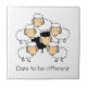 Carreau de mouton noir amusant. Un groupe de moutons blancs aux visages roses et aux oreilles grises entourent un mouton noir laineux, également avec un visage rose et des oreilles grises. En dessous, une légende "osez être différent" en lettres noires.