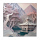 Un beau faux papier découpe paysage carreaux céramique avec montagnes, pavillons et arbres.