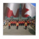 Parade de la fête du Canada avec un grand drapeau canadien en arrière - plan.