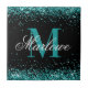 Parties scintillant Turquoise élégante Carreaux céramique Monogram noir et blanc avec un nom de script de calligraphie personnalisable et un modèle monogramme gras.