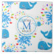 Jolie baleines bleues motif avec l'eau colorée splash oh garçon avec des gouttes dans différentes couleurs et un badge bleu clair transparent ronde avec un nom monogramme. Personnalisez en changeant le nom et l'initiale ou la personnaliser pour ajouter votre touche personnelle.