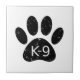 Un mignon empreinte de patte de chien de style dessin animé et texte avec l'effet grunge et angoissé appliqué à l'image. Carreaux céramiques personnalisés avec thème K9. Idée cadeau.