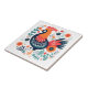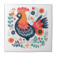 Un coq bleu indigo, noir et orange trône fièrement sur ce joli carrelage en céramique. Réalisée dans un style d'art populaire scandinave boho avec des accents de fleurs et de feuilles, cette tuile dit "Good Morning" d'une manière colorée et amusante.