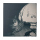 Photographie noir noir et blanc d'un chat dans la lueur d'une lampe ornée.