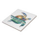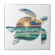 Un art numérique design de plage au coucher du soleil avec des vagues turquoise encadrées par une tortue de mer.