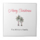 Tropical Beach Joyeux tuiles en céramique de Noël, avec une illustration de palmiers et typographie de script. Avec le lettrage personnalisable, vous ajoutez vos propres informations. Un complément festif à votre décor de vacances cuisine.