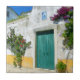 Porte en bois vert aquarelle avec fleurs colorées en fleurs dans un village méditerranéen