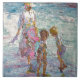 Une mère, son chapeau de soleil légèrement incliné, guide deux enfants à travers un bassin de marée scintillant de couleurs et de lumière. Ils se penchent avec curiosité, cherchant des trésors marins sous les ondulations — coquillages, pierres, peut-être des souvenirs. La scène capture l'innocence de l'enfance et la force tranquille de la présence maternelle. Les vagues brillent dans des nuances de turquoise et de lavande, tandis que des ombres douces dansent sur le sable baigné de soleil. Il y a du mouvement, mais aussi de l'immobilité — comme un moment suspendu dans l'air chaud et salé.
